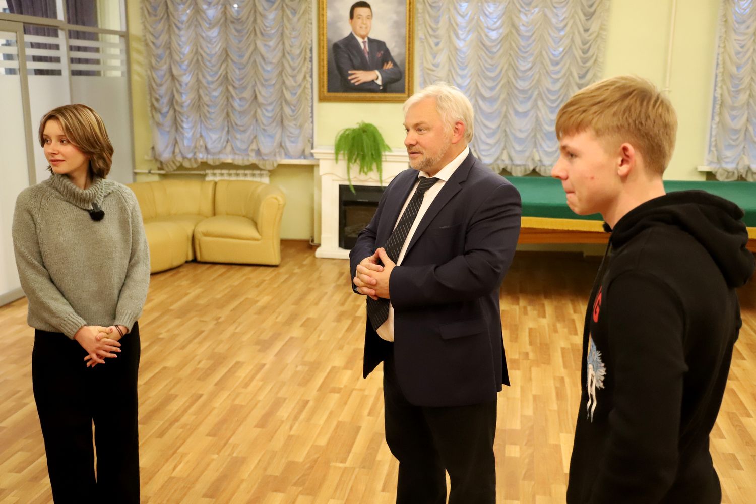 Наш ректор ИТИ, почетный работник культуры г. Москвы Дмитрий Валентинович Томилин тепло встретил гостей и лично сопроводил по учебным аудиториям Института. Сначала, Юля поприсутствовала на занятии по актерскому мастерству первокурсников мастерской Народного артиста РФ В.А. Афанасьева, и даже смогла сама принять участие в практическом упражнении. Студенты изображали звуками и движениями оригинальный оркестр с множеством инструментов. Юле это очень понравилось. Далее, гости попали на репетицию дипломного спектакля студентов Мастерской актрисы театра и кино Я.Е. Поплавской. Яна Евгеньевна их радушно встретила и показала, чем занимаются студенты выпускного курса.