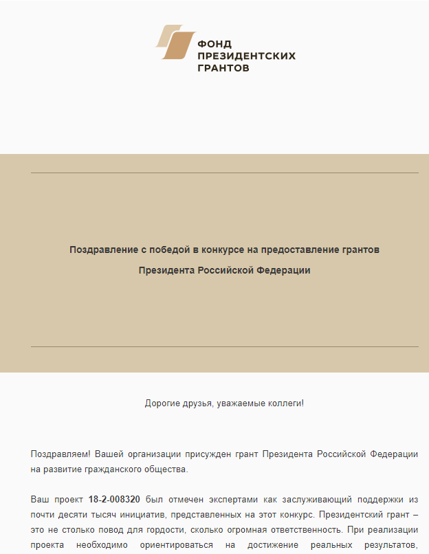 Победа в конкурсе на предоставление грантов Президента РФ
