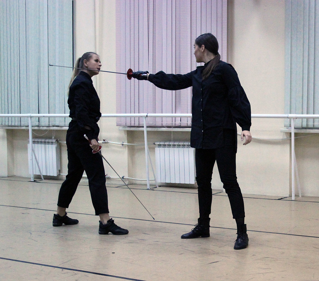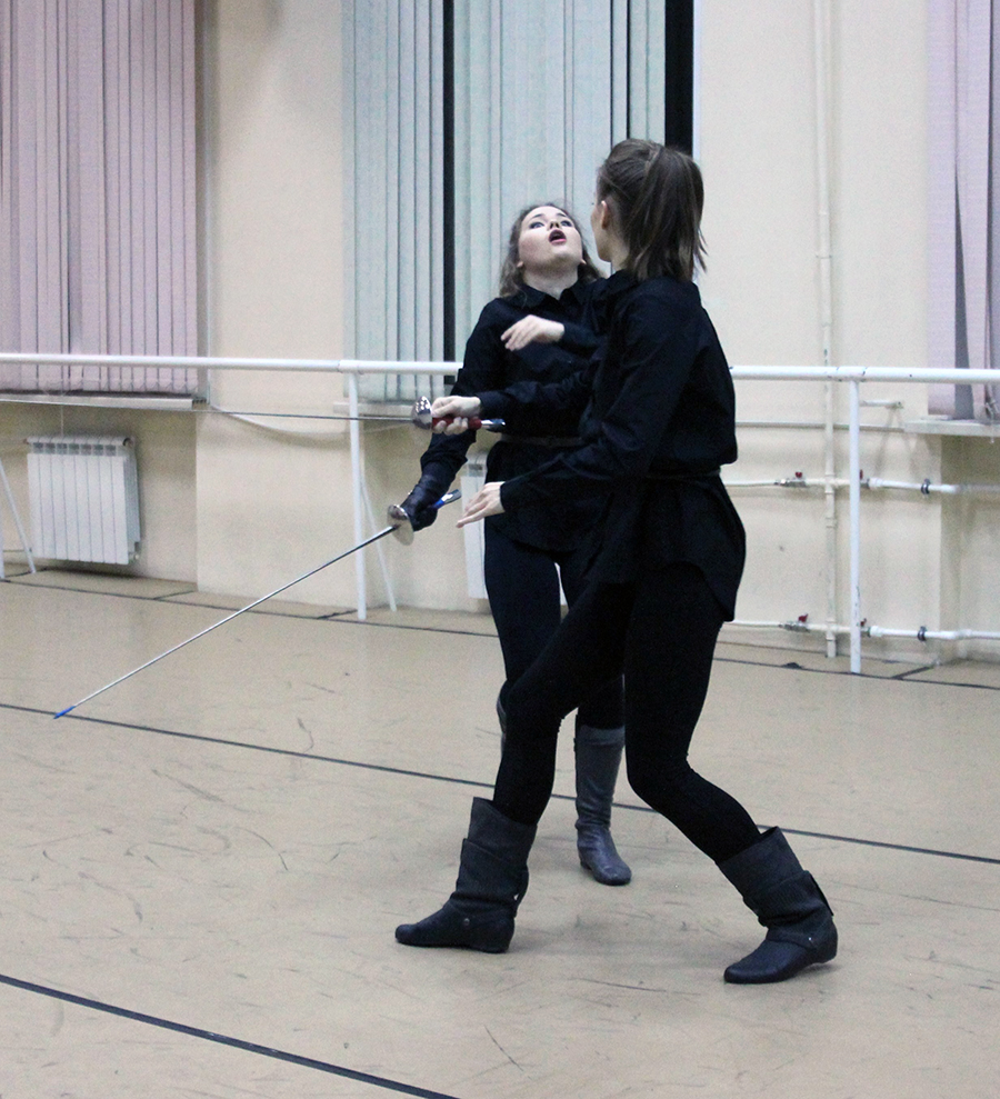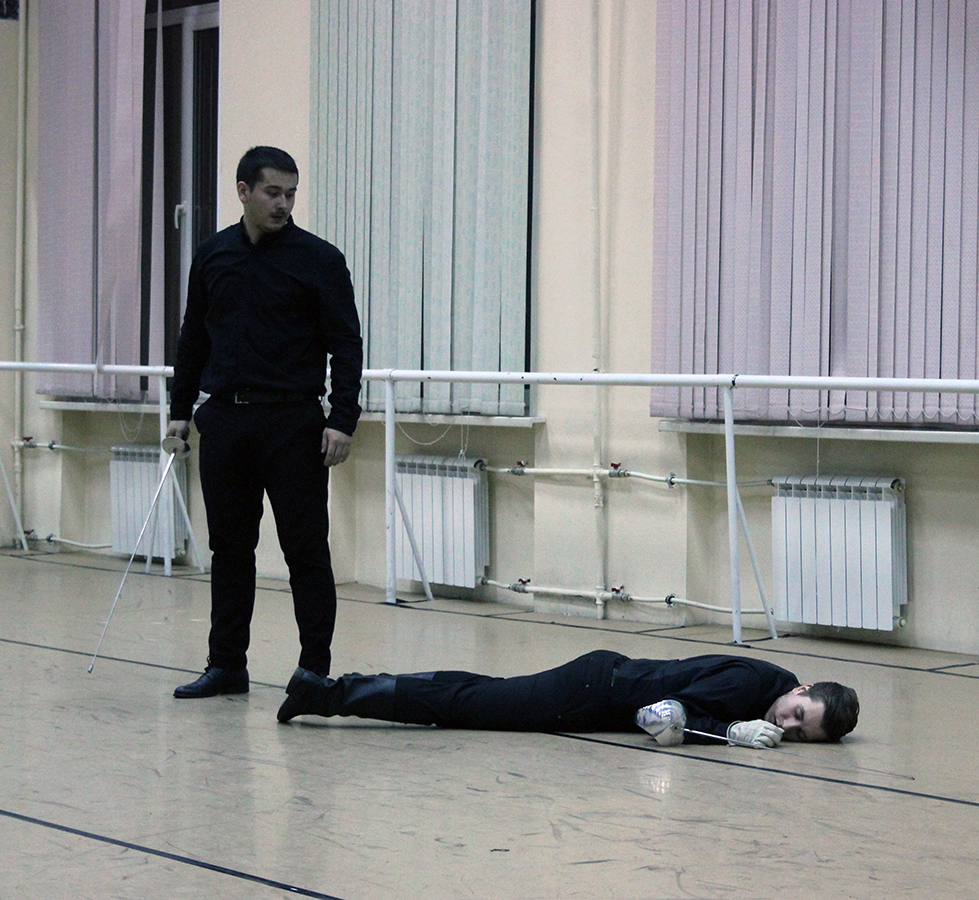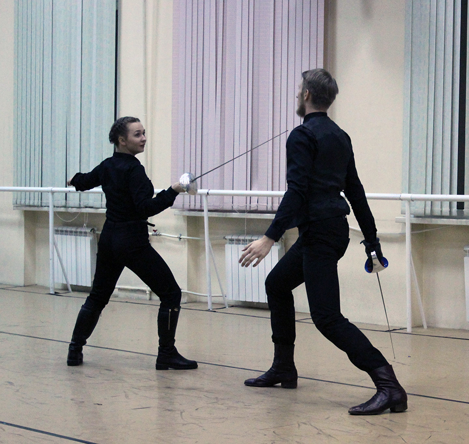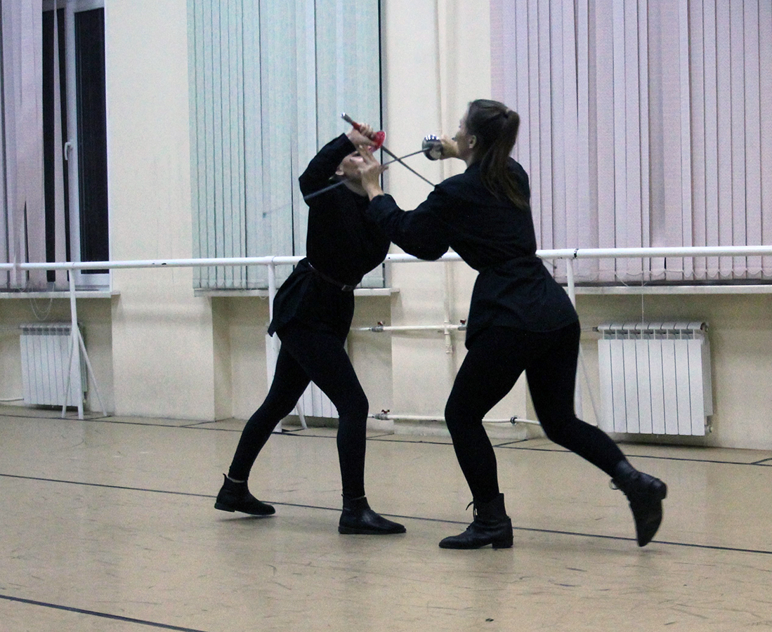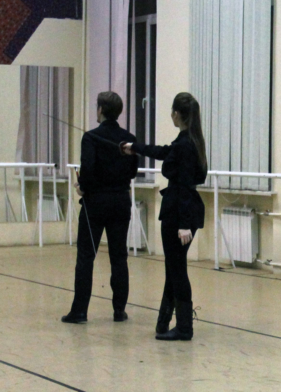 В отличие от спортивного, сценическое фехтование не требует защитную экипировку. Поэтому особое внимание уделяется технике безопасности. Здесь от партнеров требуется безошибочно четкое выполнение действия. На этот раз у ребят неплохо получилось. Никто никого не уколол! Все целы и невредимы!