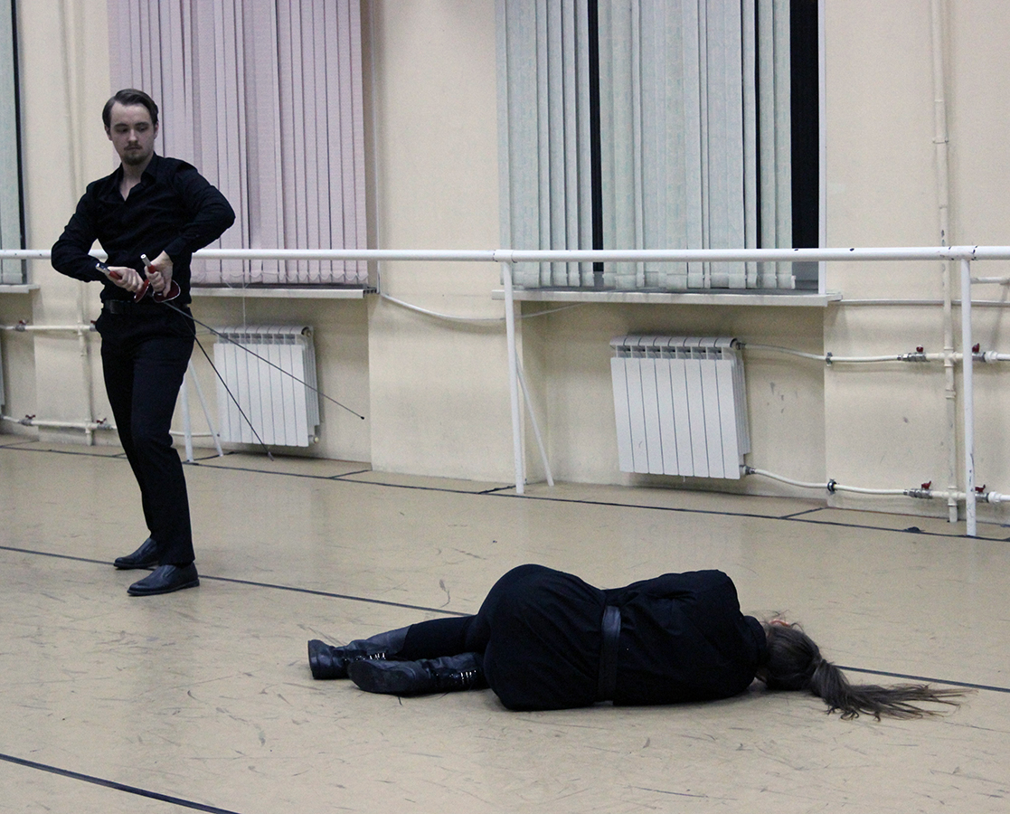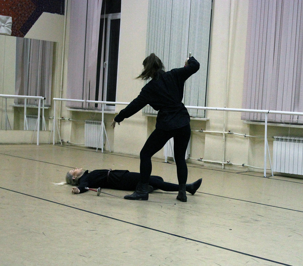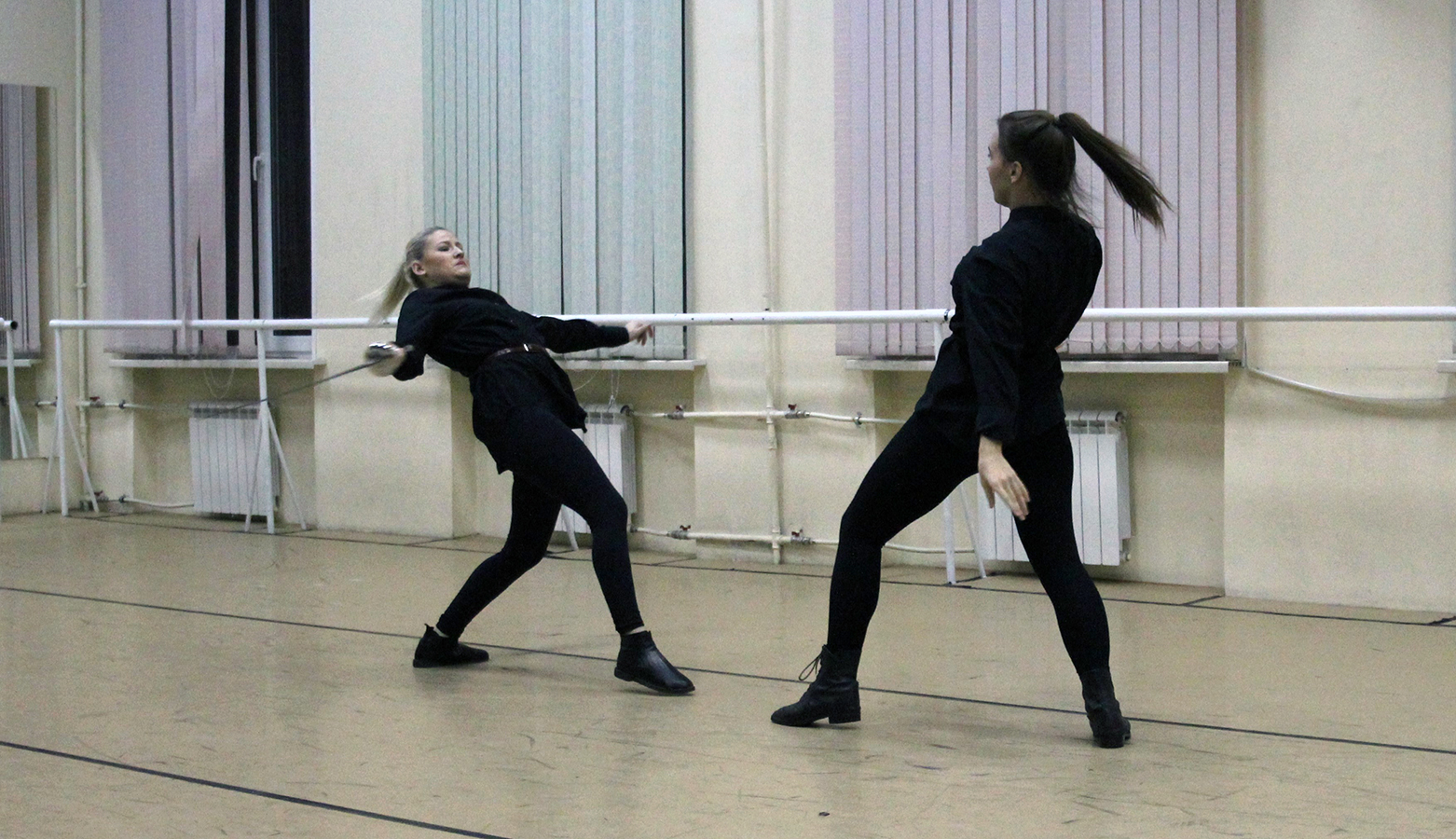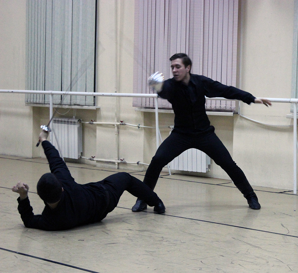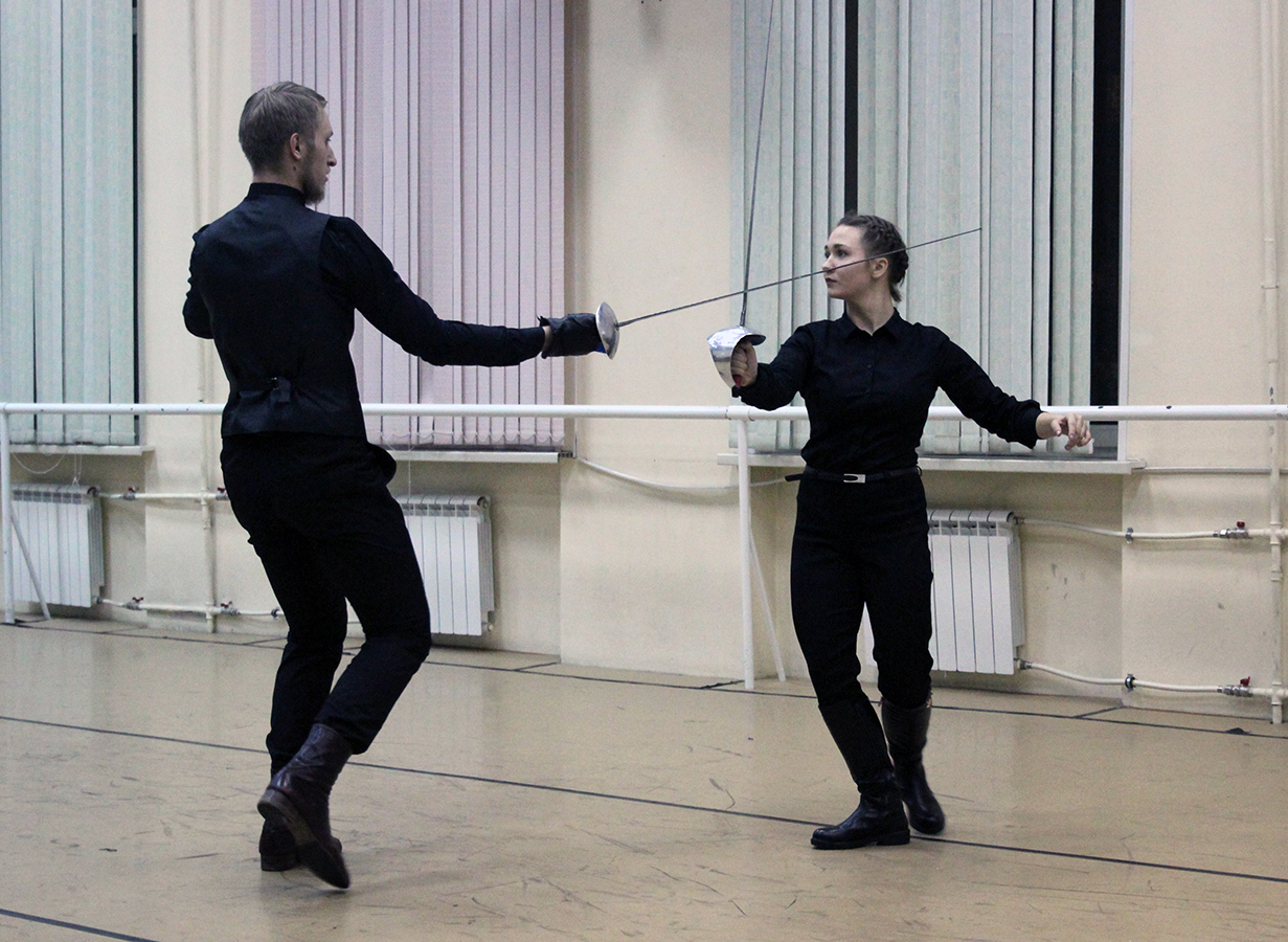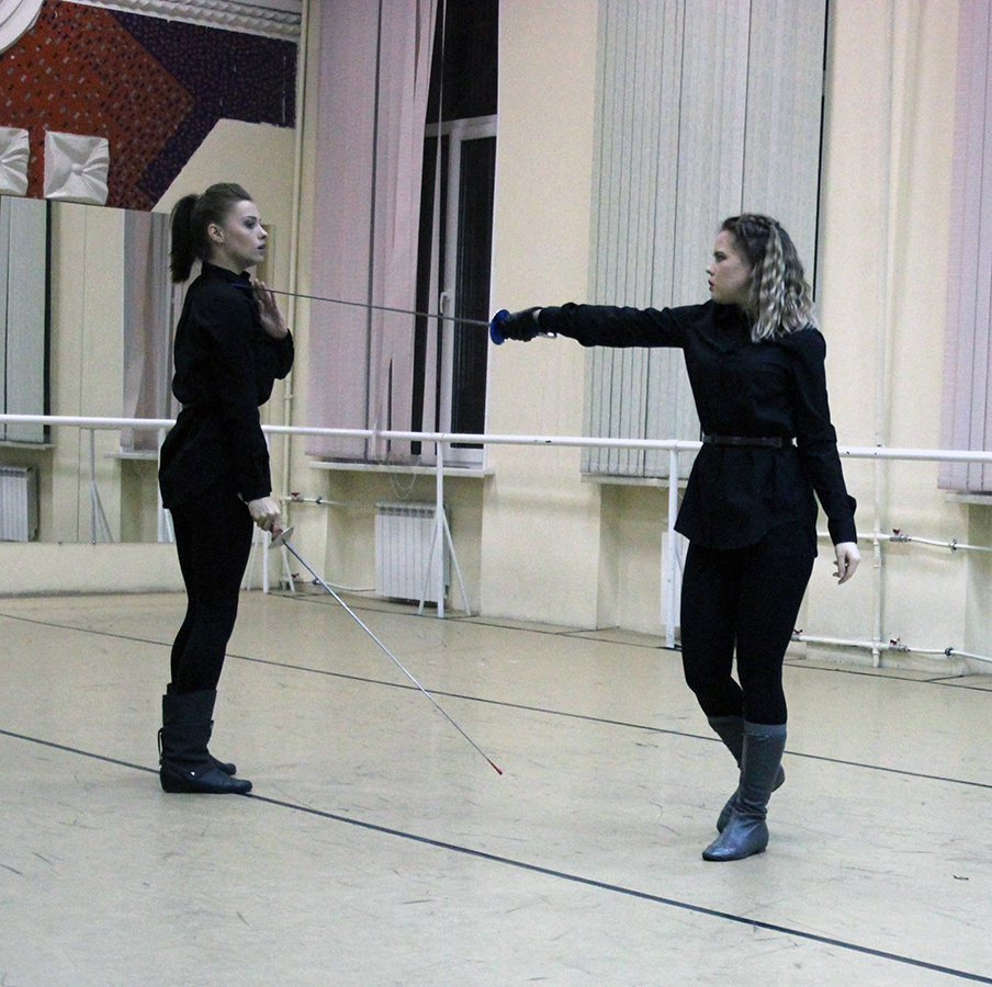 В отличие от спортивного, сценическое фехтование не требует защитную экипировку. Поэтому особое внимание уделяется технике безопасности. Здесь от партнеров требуется безошибочно четкое выполнение действия. На этот раз у ребят неплохо получилось. Никто никого не уколол! Все целы и невредимы!