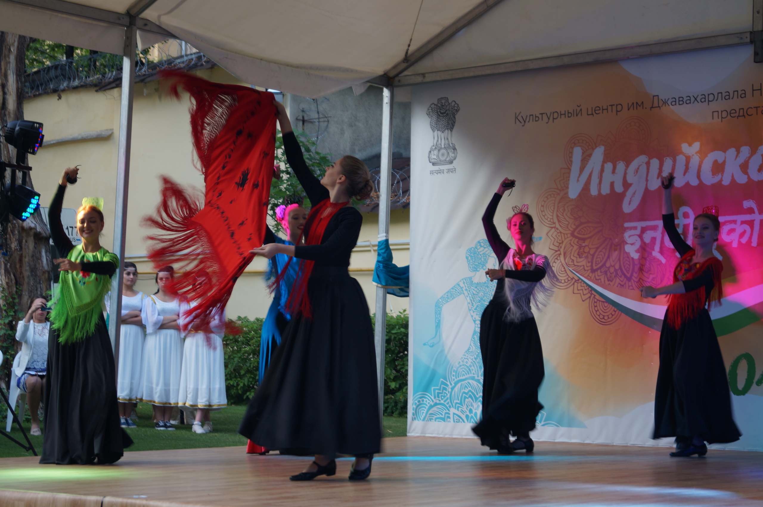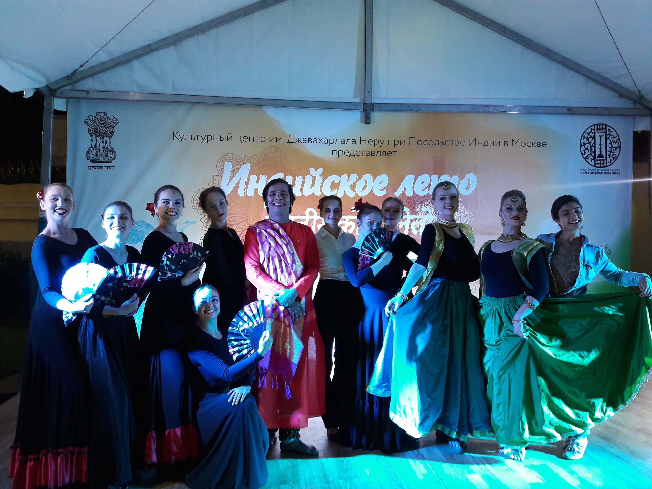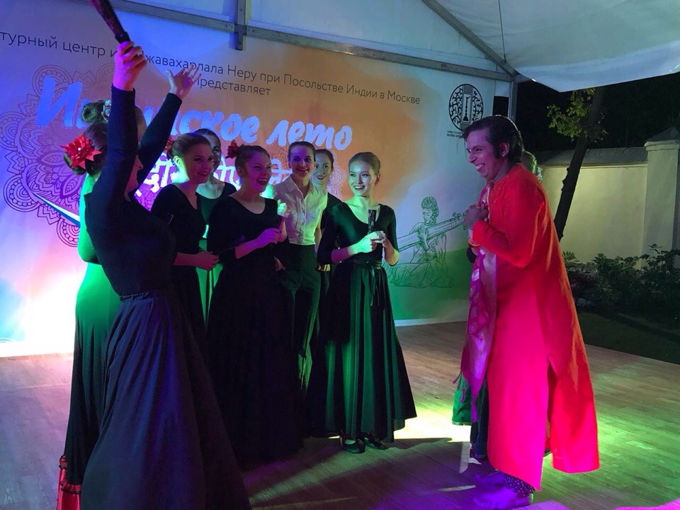 Студенты мастерской Народного артиста России Стеблова Е.Ю. 23 августа в Индийском посольстве приняли участие в концерте «Танцевальный фьюжн» в рамках фестиваля «Индийское лето». Ребята показали несколько танцевальных номеров в стиле фламенко. В финале концерта исполнили номер совместно с гуру Дхармендер Гаутам, выдающимся танцором в стиле катхак, преподавателем индийского центра им. Дж. Неру при посольстве Индии в Москве.