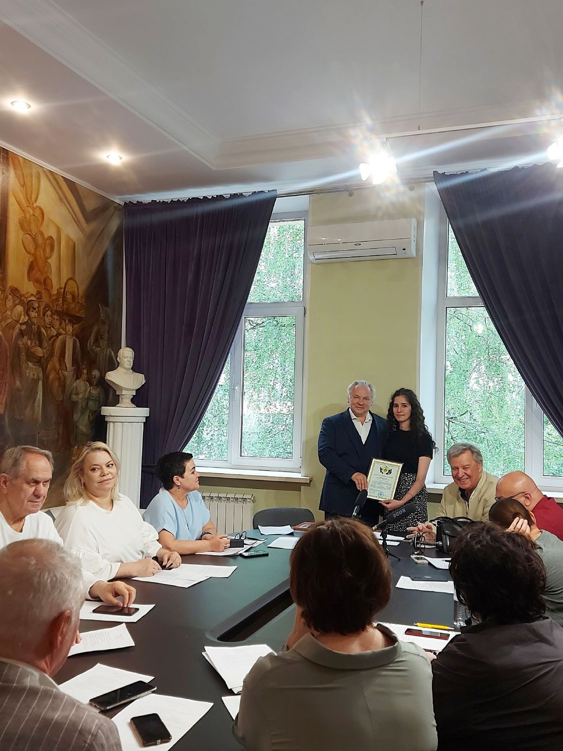 Заседание Совета началось с торжественного вручения ректором ИТИ, почетным работником культуры г. Москвы, профессором Томилиным Дмитрием Валентиновичем, почётной грамоты и благодарности заместителя руководителя ФССП РФ студентке 1-го курса (творческая мастерская народного артиста РФ Андрея Соколова) Туваевой Алике — артистке проекта «Культура в помощь Донбассу» за участие в проведении концертной программы «Всё для Победы!».